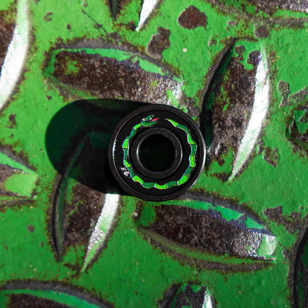Bronson Speed Co Breana Geering Pro G3 bearing featuring pro inspired graphic art theme by Charlie McHarg @appleshift4 printed with super durable ink and Geering laser etching on the outside bearing race. Go fast, stay fast with Bronson bearings!