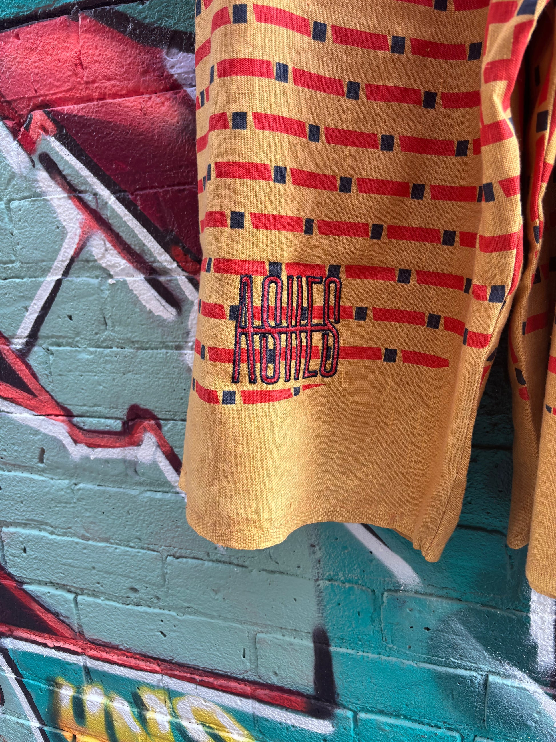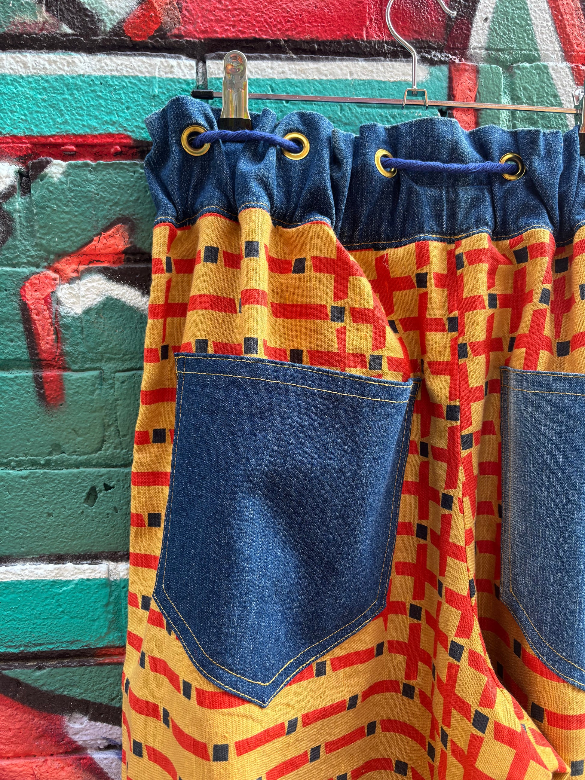 Denim pants made from Levi’s curtains and hand dyed linen cloth in ochre.